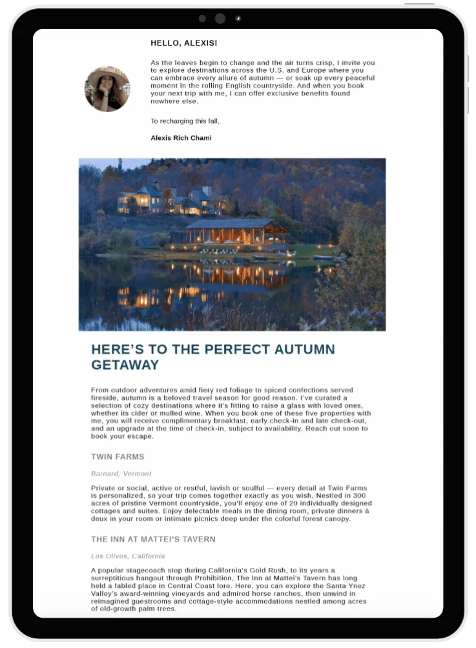 Stay top-of-mind with travelers through expertly crafted e-newsletter content that’s researched, written and sent on your behalf. Weekly SOAR emails feature thoughtfully curated travel inspiration, encouraging your clients to explore trending destinations — while booking with you.